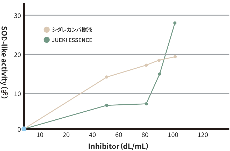 フィンランド産の白樺樹液であるシダレカンバ樹液およびジュエキエッセンスのSOD様活性試験の結果、どちらも顕著なSOD様活性を有し、それらが濃度依存的に上昇することが示されました。