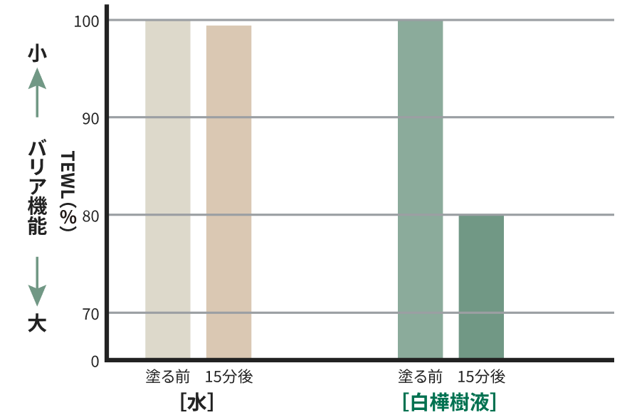角層バリア機能では、白樺樹液塗布後には水を塗布したときよりも水分蒸散量の減少が確認され、塗布15分後で80%と高い減少率を示し、うるおいを逃がさず肌バリア機能向上したことがわかります。