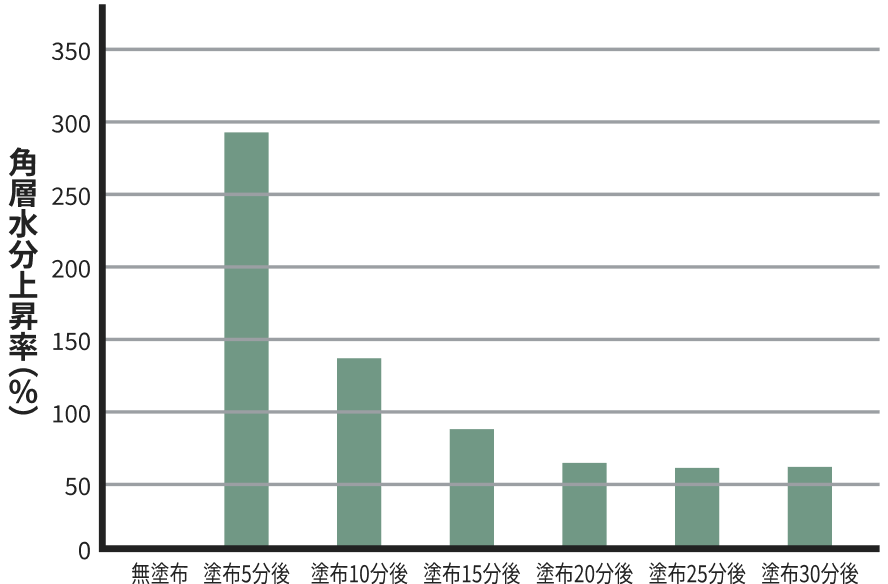 白樺樹液塗布5分後の角層水分上昇率が289%と最も高くなり、その後時間とともに上昇率は減少しましたが、塗布後20分以降の水分上昇率は約 60%で安定し、塗布後30分を経過しても無塗布時の水分量とくらべて61%の上昇率を示しました。角層にうるおいを長時間キープする効果がわかります。