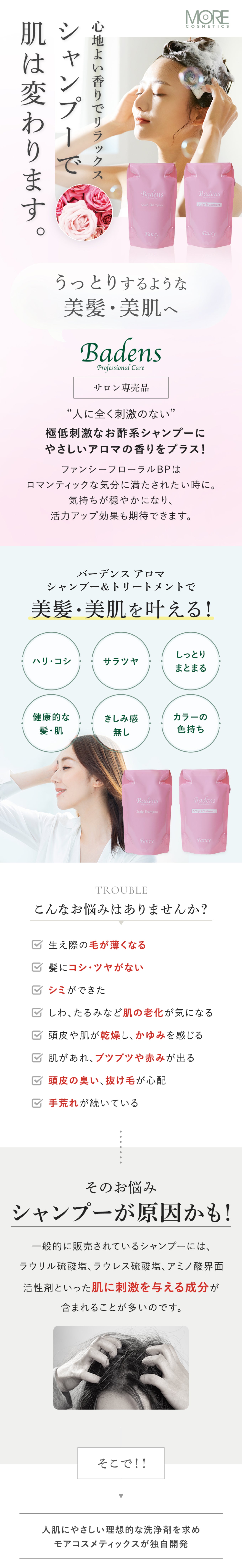 アトピー性皮膚炎があり、シャンプーが合わないとすぐフケが出てしまうのですが、バーデンスを使い始めてからそれが減りました。枝毛ができやすい髪質なのですが、それも多少は改善されました。