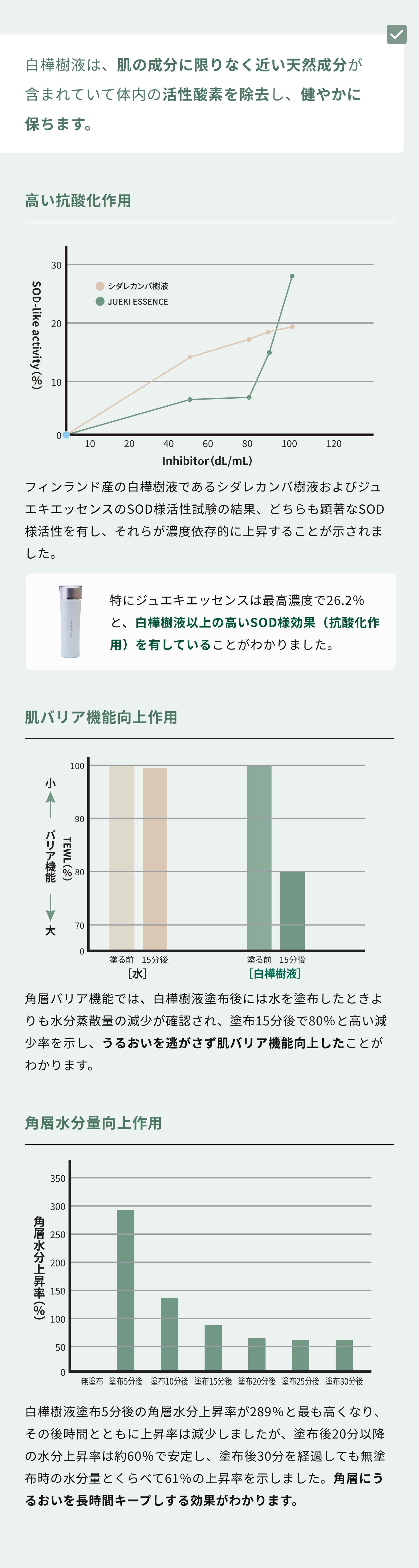 JUEKIシリーズは水を一切使用せず白樺ジュエキ100%で作られた唯一無二の商品です。JUEKIシリーズは、抗酸化作用、保湿作用に優れており、肌なじみも抜群です。