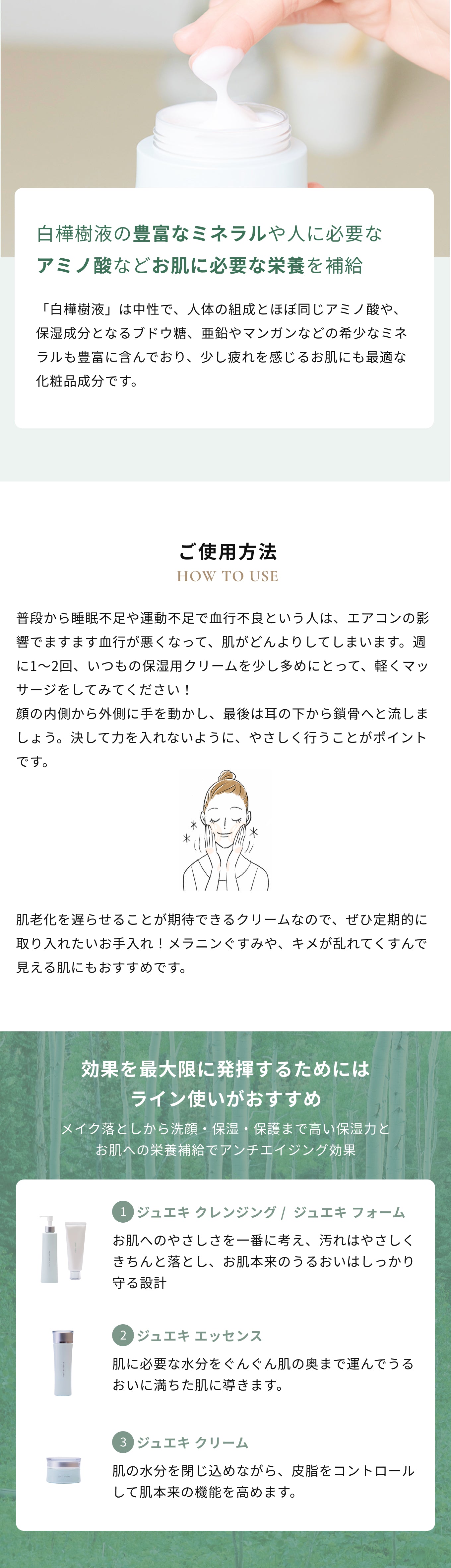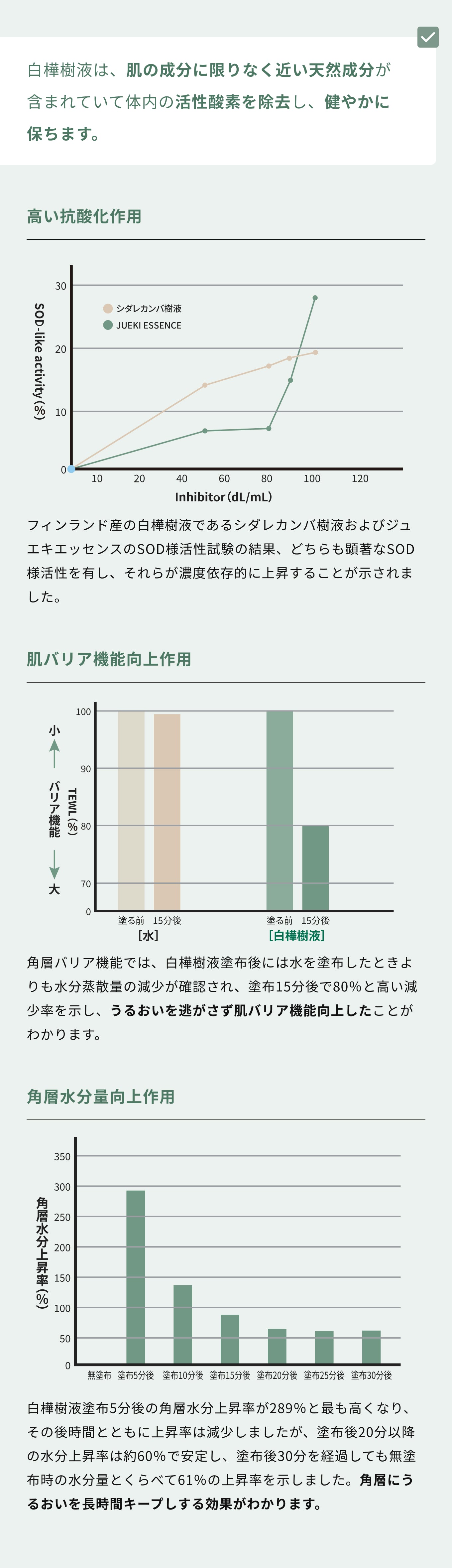 JUEKIシリーズは、一切水を使わない100%白樺樹液コスメで抗酸化作用や保湿力に優れております。