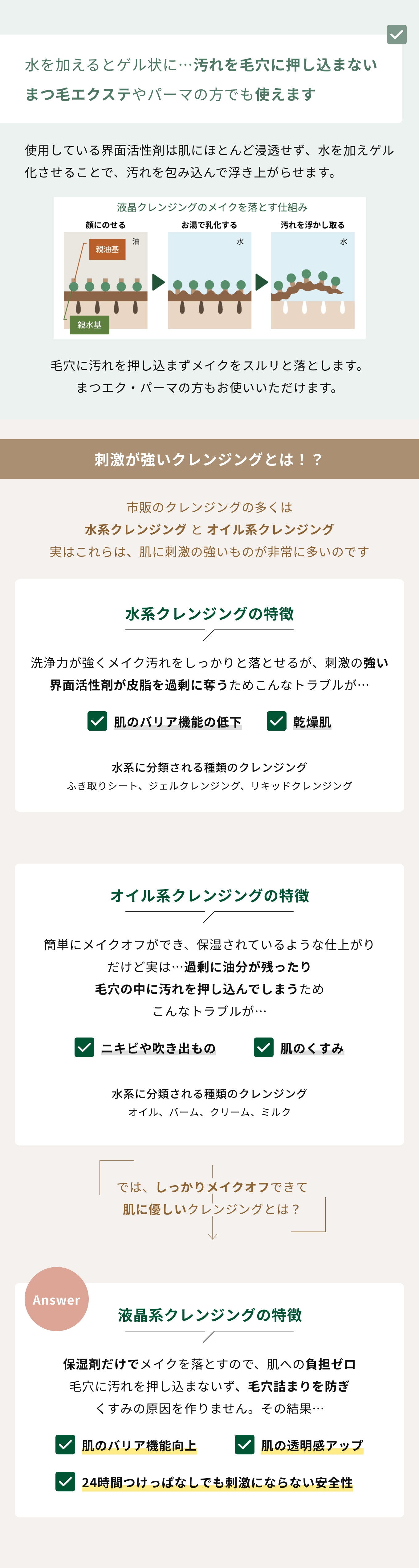 保湿できるくらい肌に優しいクレンジングを作らねばならないという使命の元、全く新しい液晶クレンジングを開発しました。