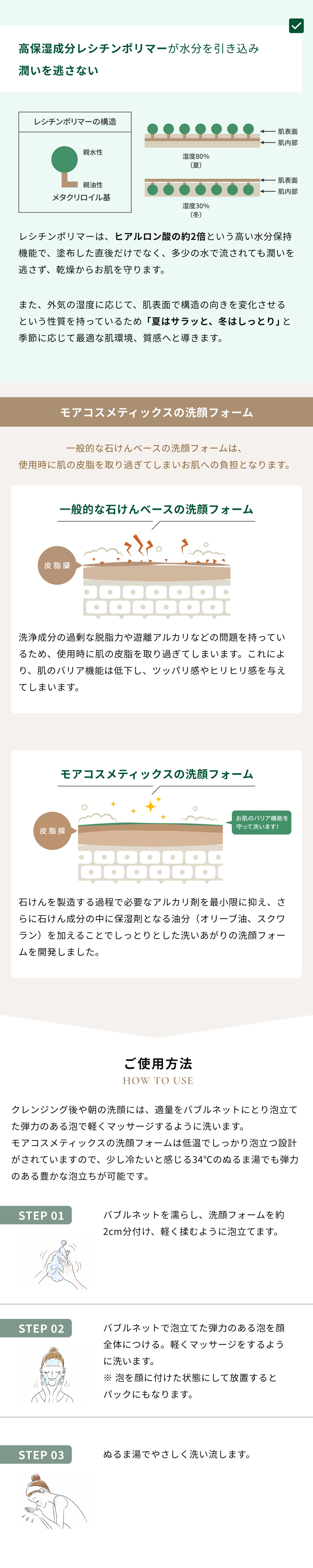 ぬるま湯でもよく泡立ち、弾力のあるクリーミーな泡が汚れをやさしく包んできちんと落とします。また、レシチンポリマー、オリーブ油配合で洗い上がりのしっとりを持続させます。