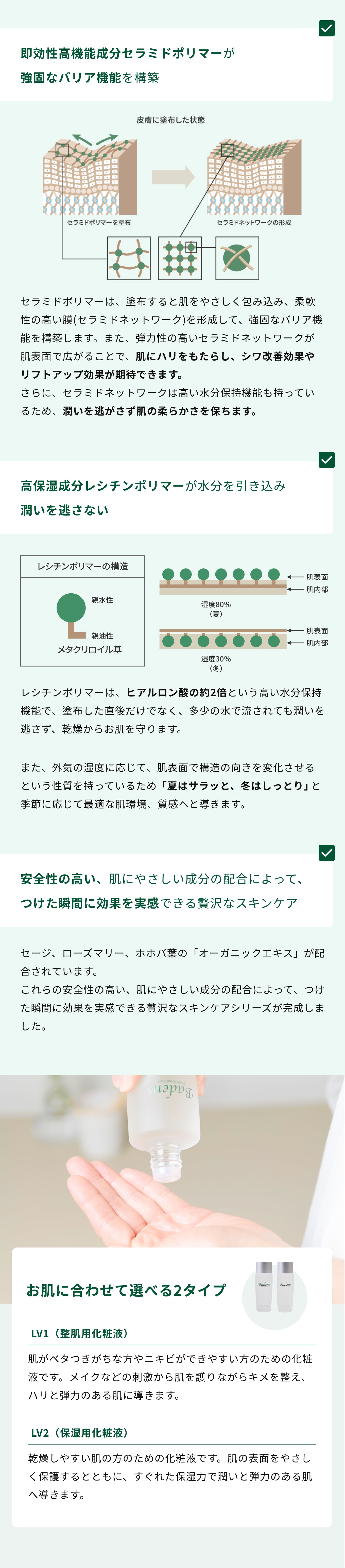 バーデンス セルシリーズは重ねづけすることでセラミドとレシチンの美容成分が浸透しやすくなります。
