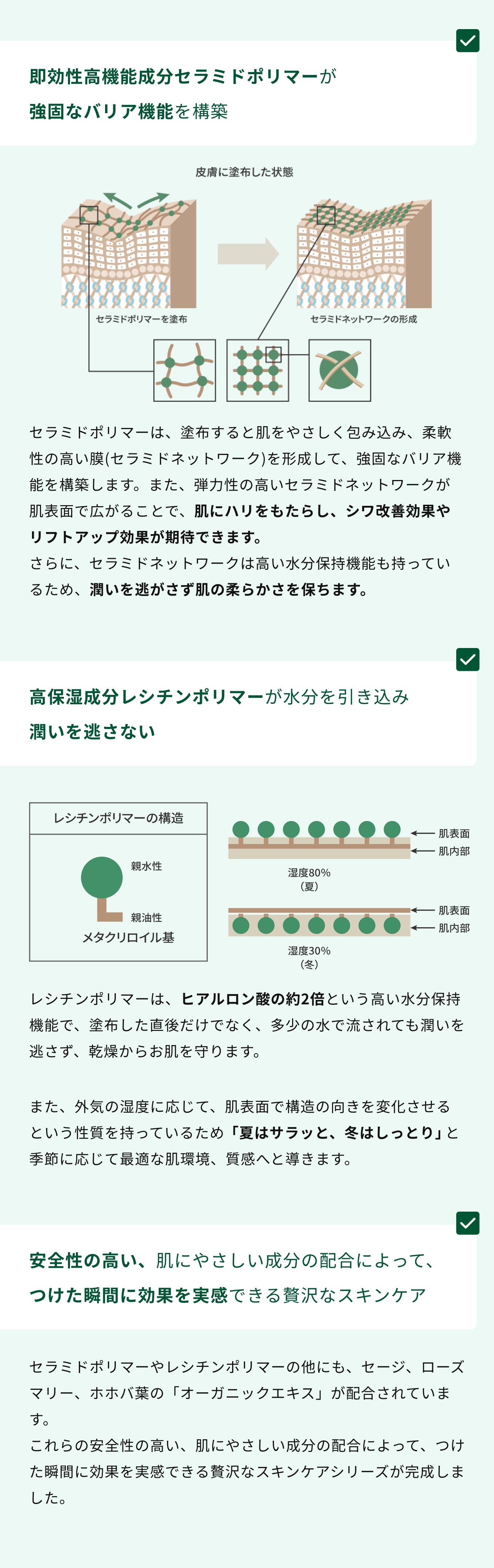 レシチンポリマーはお肌に水分を、セラミドポリマーはお肌にハリを与えます。