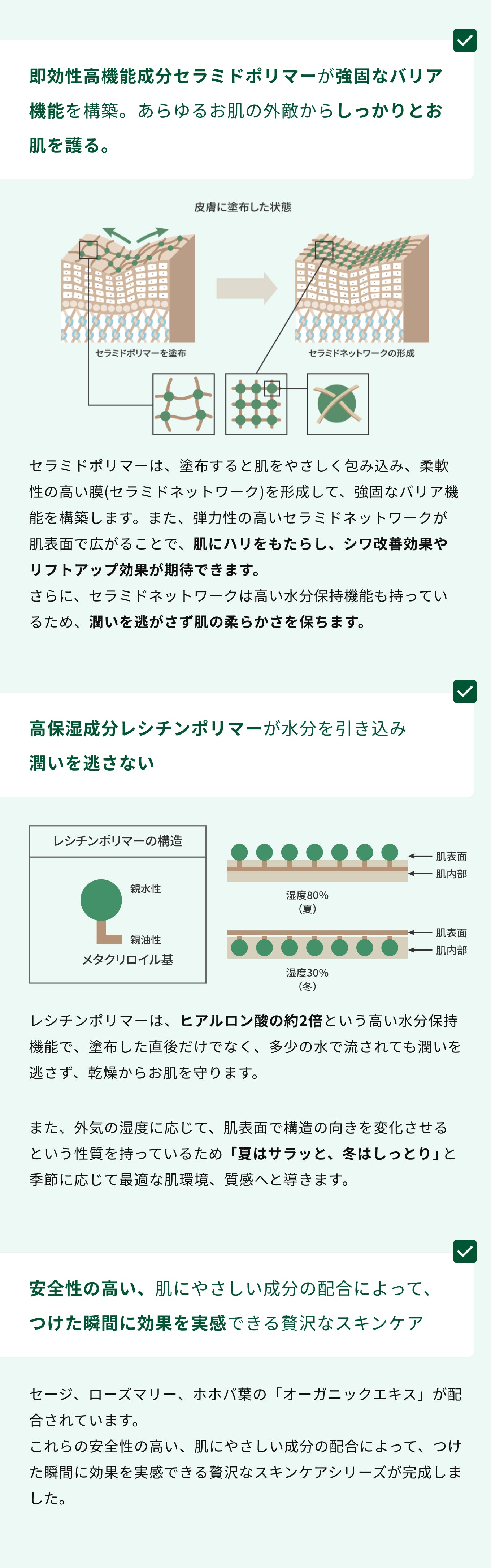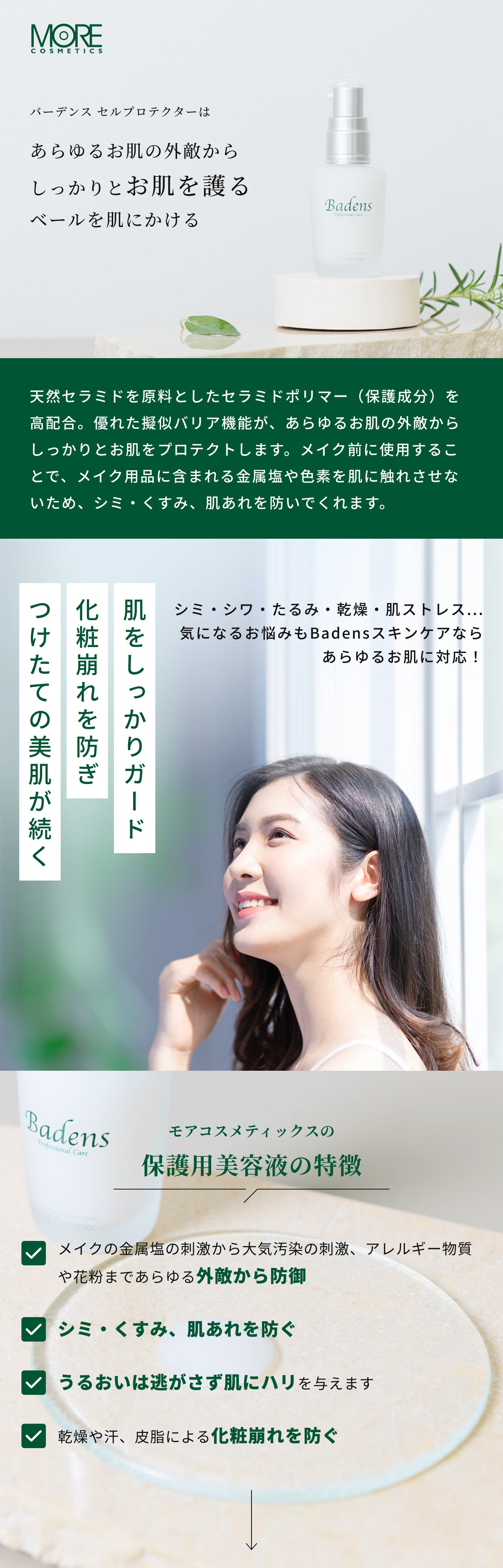 天然セラミドを原料としたセラミドポリマー(保護成分)を高配合。優れた擬似バリア機能が、あらゆるお肌の外敵からしっかりとお肌をプロテクトします。メイク前に使用することで、メイク用品に含まれる金属塩や色素を肌に触れさせないため、シミ・くすみ、肌あれを防いでくれます。