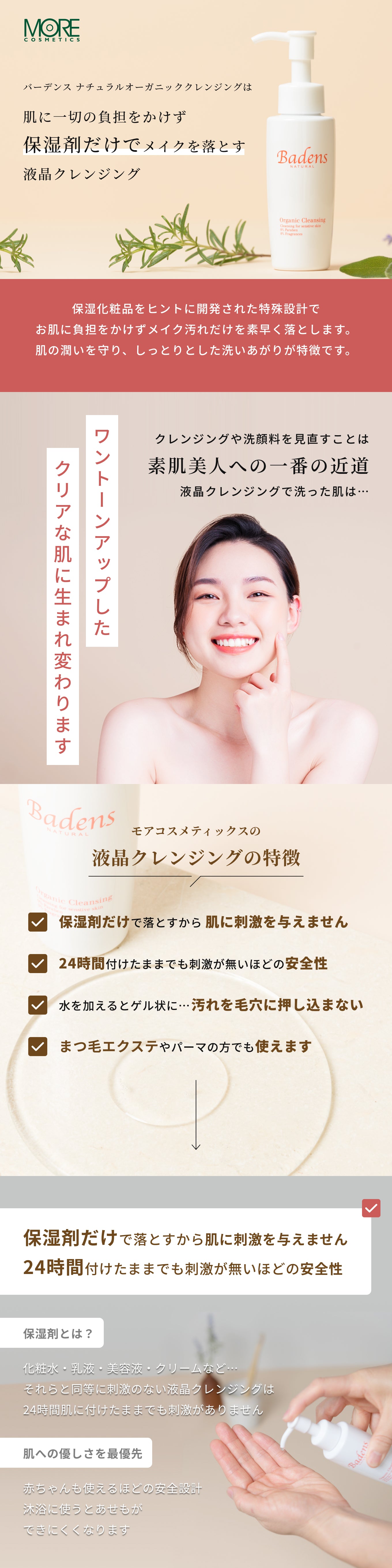 モアコスメティックス独自の液晶系クレンジングにオーガニックエキスと天然精油配合したオーガニッククレンジングです。 メイク汚れを毛穴に浸透させず、すっきりと素早くメイクを落とします。