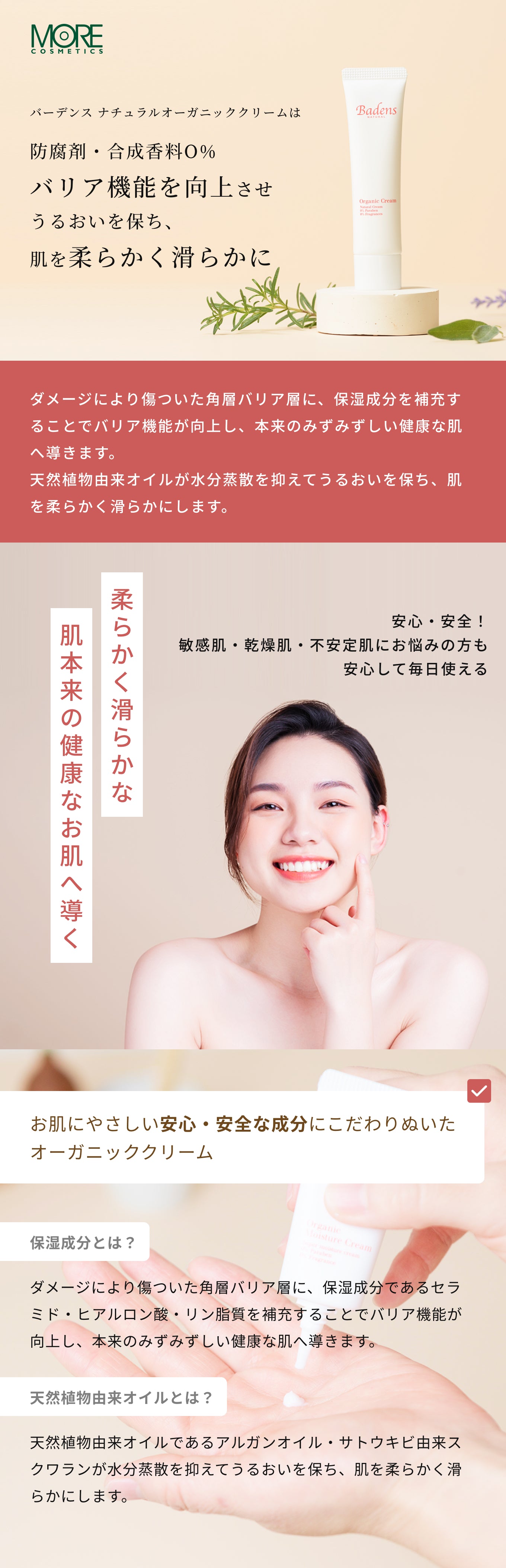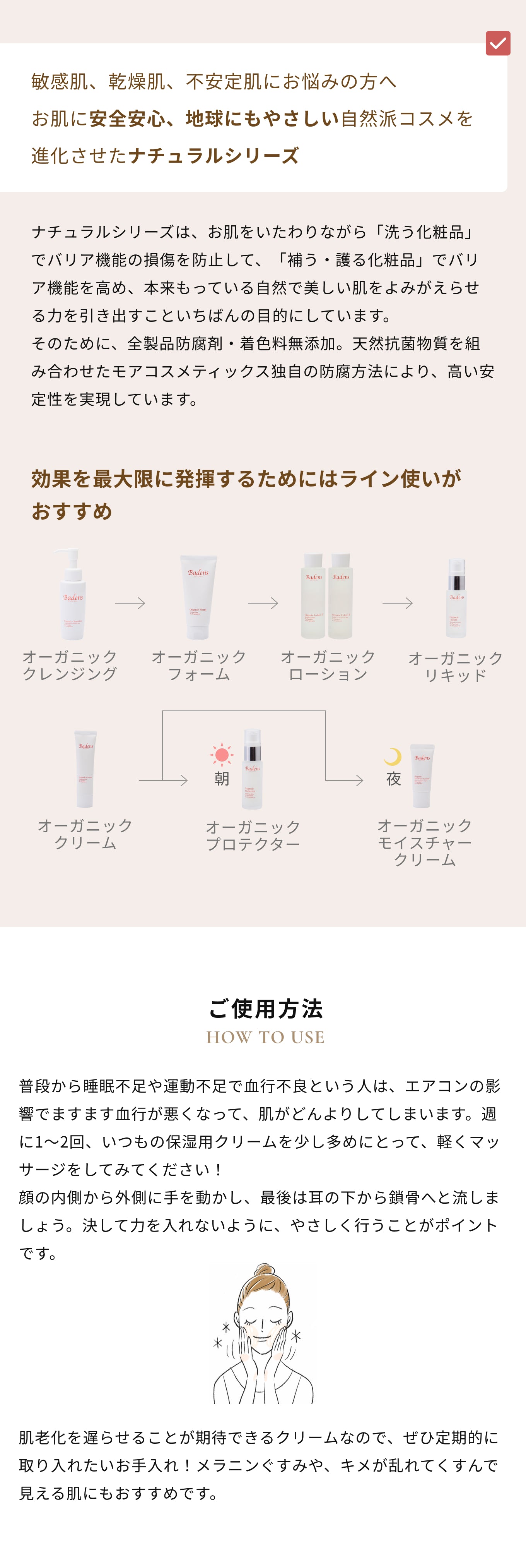 乾燥肌に最も必要な保湿成分(セラミド・ヒアルロン酸・リン脂質 )と天然の植物由来オイルを融合させた天然型保湿クリームです。