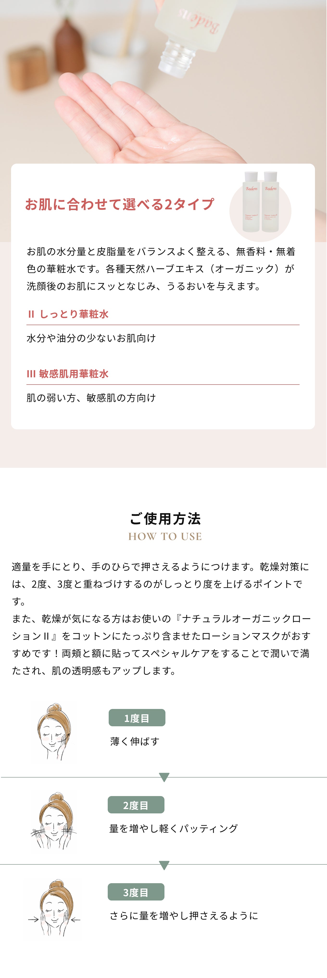 お肌の水分量と皮脂量をバランスよく整える、無香料・無着色の華粧水です。各種天然ハーブエキス(オーガニック)が洗顔後のお肌にスッとなじみ、うるおいを与えます。