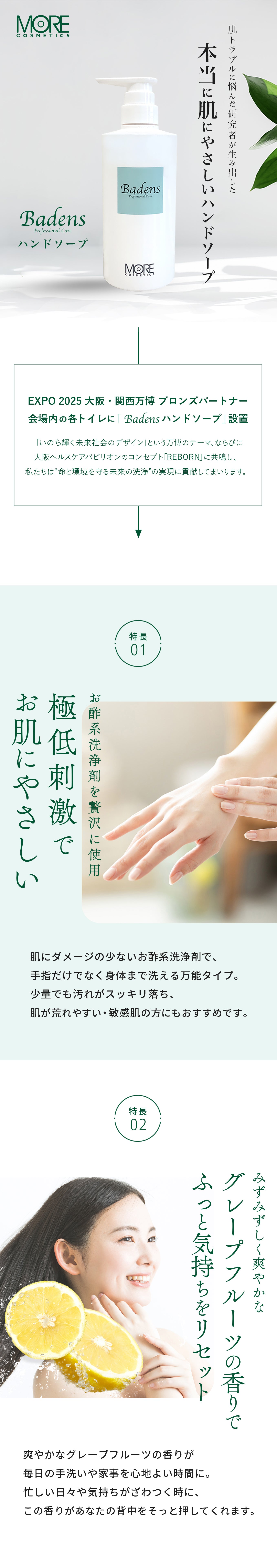 万博のトイレで使用して、普通のトイレにはこんないい香りのハンドソープってなかなかないよね?と気になってました。某大阪のテレビ局さんがされてたYouTubeでモアコスメティックスさんを知り、あのハンドソープが買えるの??と早速検索して注文しました。市販のハンドソープだと石けんカスの様な白いものが残っていたのてすがそれが無いし、突っ張らず、香りも良くて癒されてます。泡タイプにして洗顔、ボディにも使えて用途決めて買わなくて済んで助かってます。ハンドソープ用の小さめの詰め替え容器もあるといいなと思いました。